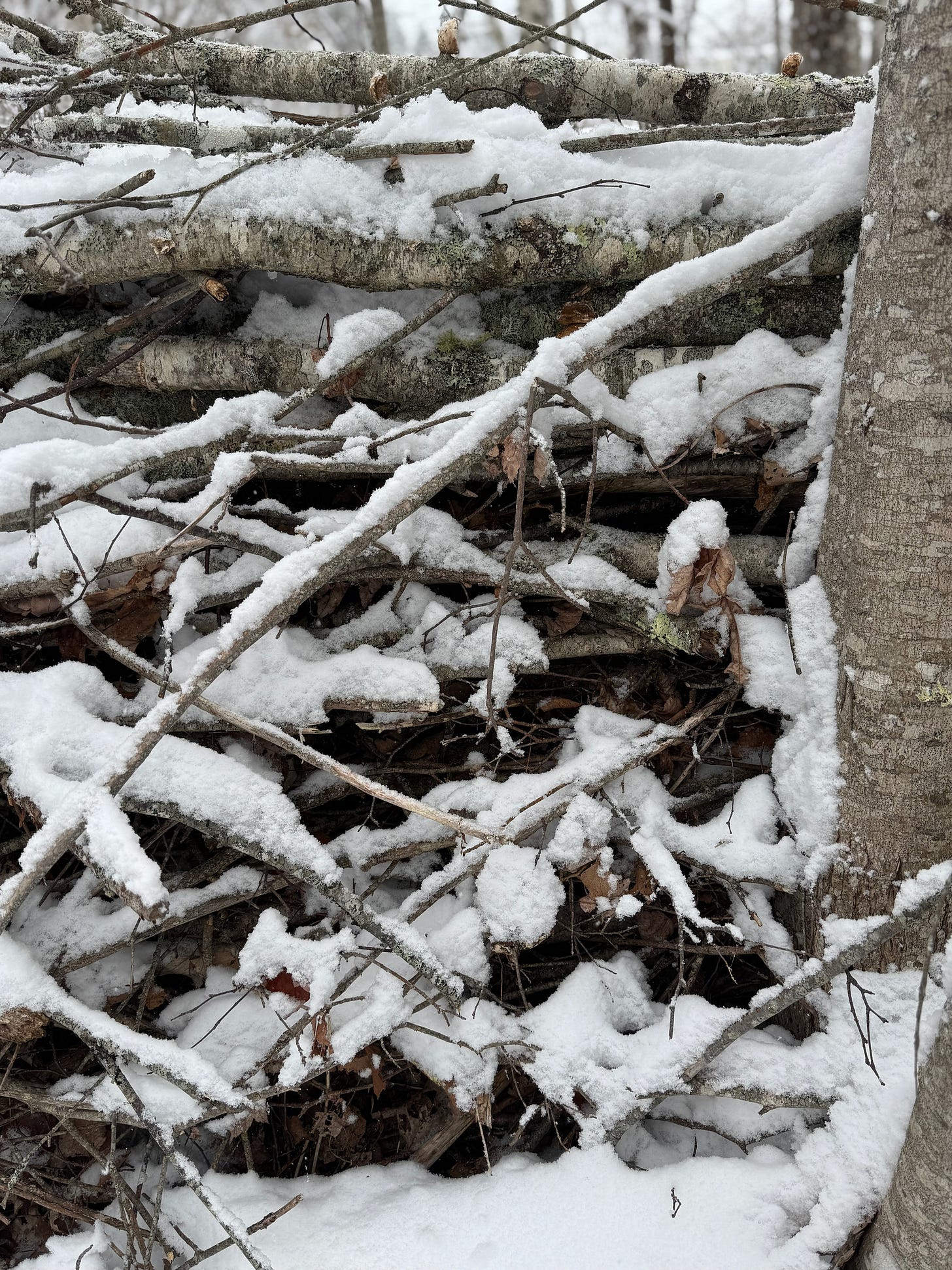 It’s Tuesday. Yesterday we managed to venture back outside to check up on the apartment complexes at the bottom of the field. This is the newest one, built with materials as they become available throughout the year. The bigger sticks act like I-beams to hold up all the twigs and branches, all of which gets fully insulated by falling leaves in the autumn. It’s a brilliant system.