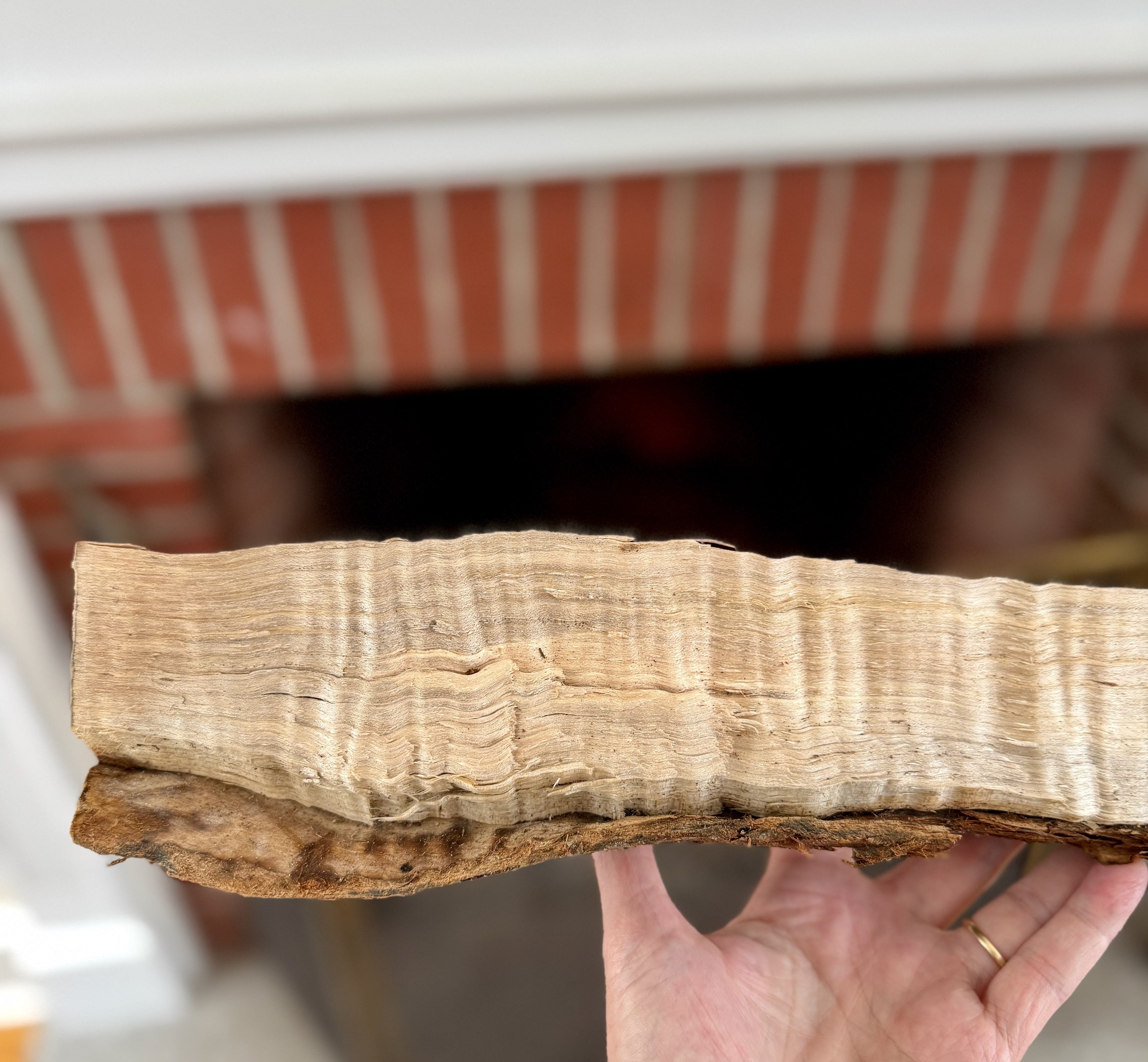 The batch of wood we got delivered this spring has been a bit more unusual than in years past. Already, I’ve encountered a bunch of logs that look like this—and I have to stop and marvel at the crimp pattern. It’s almost too beautiful to burn, as if the tree had been growing a lustrous coat of wool and hiding it beneath its bark, waiting for this moment to be discovered.